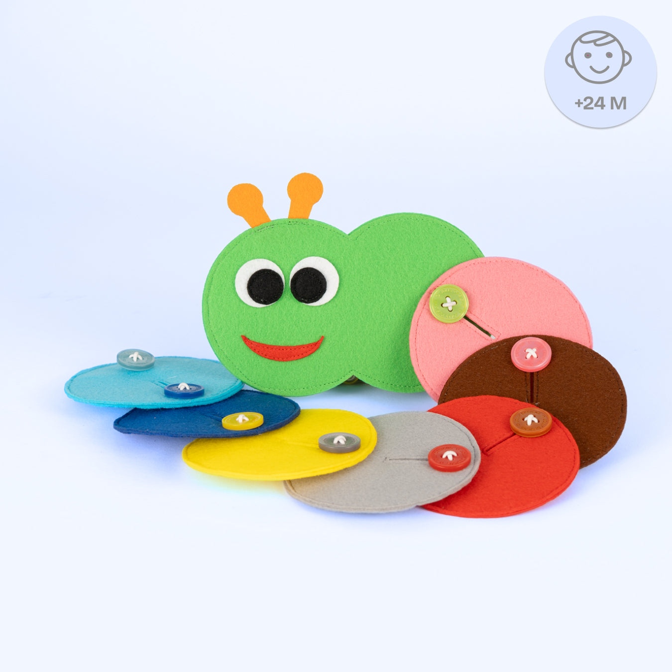 Cette joyeuse chenille invite les enfants à découvrir les couleurs, à s’exercer à boutonner et à développer leur créativité en jouant. Huit éléments colorés en feutrine peuvent être assemblés au visage souriant de la chenille – chaque segment devient ainsi une petite aventure d’apprentissage.