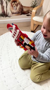 Le prix est dû au fait que chaque livre est fabriqué à la main, pièce par pièce – par exemple, chaque couture, chaque pièce est cousue individuellement. Les livres subissent des contrôles de qualité rigoureux pour garantir qu'ils soient sûrs pour les petites mains. Ils sont intemporels, durables, de haute qualité et résistent à des années de jeu intensif. Leur valeur reste constante. La fabrication des livres est extrêmement longue et complexe.
